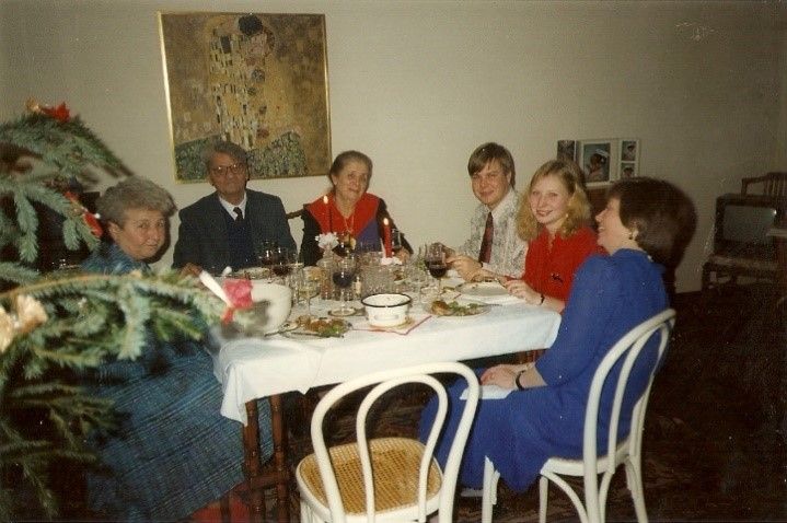 Die meiste Arbeit macht der Salaati. Rote Rüben werden gekocht, auch Kartoffel und Karotten, alles wird sehr kleinwürfelig geschnitten und mit ebenso fein geschnittenen Zwiebeln, Essiggurken und Äpfeln gemischt. Als Dressing kommt Schlagobers, gefärbt mit dem Saft von den Roten Rüben. Kirsi hilft dabei wie damals in Tarvasjoki und bäckt nebenbei Pulla (Gebäck aus Germteig). Nebenbei schaut sie oben in der Mansarde nach dem Rechten. Rainer und Mama putzen den Baum auf. Mama hat etlichen Schmuck aus Wien mitgebracht. Hauptsächlich billige chinesische Importware. Die Chinesen, die das angefertigt haben, werden sich gewundert haben, wozu das gut sein und wer so etwas brauchen soll. Wir haben dazu ein paar Glaskugeln gekauft, auch Lametta und elektrische Kerzen. Kirsi bastelt glitzernde Kreationen aus Stanniol. Behängen darf nur Rainer. Er betreibt es wissenschaftlich. Prüft jeden einzelnen Hängeplatz aus verschiedenen Perspektiven, verwirft ihn, hängt neuerlich. Mama ist verzweifelt. Bei ihr ginge das ruckzuck. Sie leidet. Vor allem, weil sie schon so gespannt ist auf die Bescherung. Nicht, dass sie etwas für sich erwartet. Nein, ihre Spannung richtet sich darauf, die Freude der Anderen zu erleben, die sie mit ihren unzähligen Päckchen beglücken will. Jetzt ist es schon fünf vorbei und Rainer hängt noch im unteren Drittel herum. Er hat unten angefangen, weil noch nicht klar ist, wie er das oben machen wird. Unsere Haushaltsleiter ist viel zu niedrig, um die Spitze zu erreichen. Wenn er scheinbar nicht hinsieht, hängt Mama selber rasch ein Stück an einen Ast. Natürlich bemerkt es Rainer. Er brüllt. Nein! Das passt dort gar nicht! Er nimmt das Stück wieder ab, ist unschlüssig, wohin damit. Klar, sein Gedanke war ja gerade damit beschäftigt, einen guten Platz für ein ganz anderes Stück zu finden. Jetzt hat er plötzlich zwei in der Hand. Schließlich hängt er das Stück an die Stelle, die Mama zuvor geeignet erschienen ist. Stress pur.
