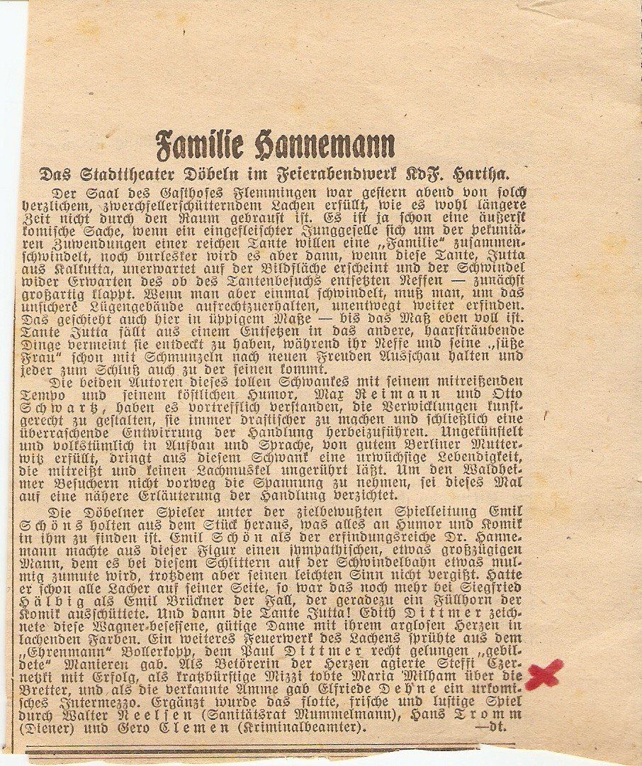 Zwei Tage danach gaben alle Neuen im Ensemble einen musikalischen Abend, um sich dem Döbelner Publikum vorzustellen. Ich war die einzige Wienerin. Wir hatten großen Erfolg. Die Zeitung war voller Lob. Nur der Kapellmeister war nicht zufrieden mit mir. Bei der nächsten Probe meinte er, ich müsse schon zu ihm hinunterschauen und seine Tempi beachten. Na, ich hatte einen Riesenzorn auf den! Vor allen anderen hat er mich heruntergeputzt. Meine Verteidigung ‚Wienerisch ist anders als deutsch‘ war auch nicht wirklich gscheit. Der Zufall wollte es, daß wir wenig außerhalb Döbelns in derselben Straße wohnten und daher nach den Proben denselben Heimweg hatten. Ich mußte immer viel von Wien erzählen. Er war sehr interessiert an Österreich. Im Lauf der Zeit habe ich mich sehr an den Herrn Kapellmeister angeschlossen. Er war so seriös und überhaupt nicht zudringlich, was man von den anderen Kollegen nicht sagen konnte. Sogar die Operettensängerin wollte mich vernaschen. Gottseidank haben mich meine Kolleginnen gewarnt, als ich in der Garderobe strahlend erzählte, ich wäre zum Kaffee bei ihr eingeladen. Damals hatte ich noch keine Ahnung, daß es ‚sowas' gibt.“