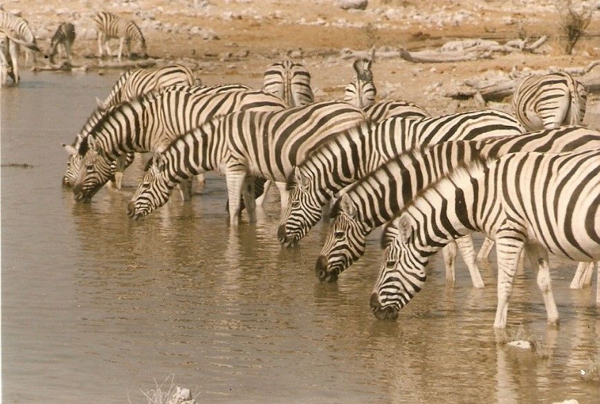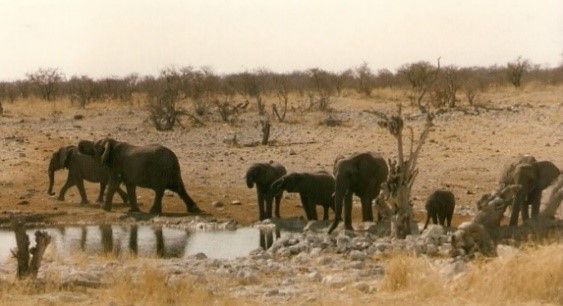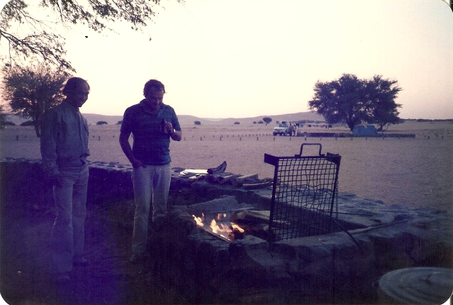 Okaukuejo liegt am südlichen Rand der Etosha-Pfanne. Das ist ein ausgetrockneter Seeboden, hundertzwanzig Kilometer lang und fünfzig breit, auf tausend Meter Seehöhe. Die riesige Pfanne schimmert wegen des Kalk- und Salzgehalts des Bodens weiß. Die ganze Gegend ist Nationalpark. Ulli hat für die ganze Gruppe Zimmer im Camp reserviert, auch für uns Camperbesatzung. Das Camp steht unmittelbar an einem Wasserloch, eines der wenigen weit und breit, daher ist es für die Tiere im Umkreis ein unvermeidlicher Anziehungspunkt. Früher oder später kommt hier jedes Tier vorbei. Man setzt sich einfach auf die einladende Terrasse des Restaurants und schaut sich die verschiedenen Gäste an. Elefanten, Giraffen, Antilopen, Hyänen, Strauße, Zebras kommen trinken. Nashörner und Großkatzen haben gerade keinen Durst. In der Familie Zaczek sind sie alle zoologische Enthusiasten. Heinz und Ulli machen jedes Jahr weite Reisen durchs südliche Afrika, die hauptsächlich dem Tiere beobachten gewidmet sind. Dazu gibt es hier reichlich Gelegenheit, sei es in Südafrika, Botswana, Simbabwe, Sambia oder Mozambique. Heuer eben Namibia. Aber auch die Fotoapparate der weiteren drei Damen kommen nicht zur Ruhe bis die Verschlüsse heiß laufen. Annamaria und ich bestaunen die Tiere auch, aber uns fesselt mehr das Gesamtbild des fremden Landes. Das Camp bietet eine Anzahl gemauerte Feuerstellen an, die zum Grillen eingerichtet und mit reichlich Brennholz ausgestattet sind. Braai nennt man hier das Grillen. Im Zuge unserer Reise werden wir abends noch oft Braai machen. Heute üben wir schon einmal.