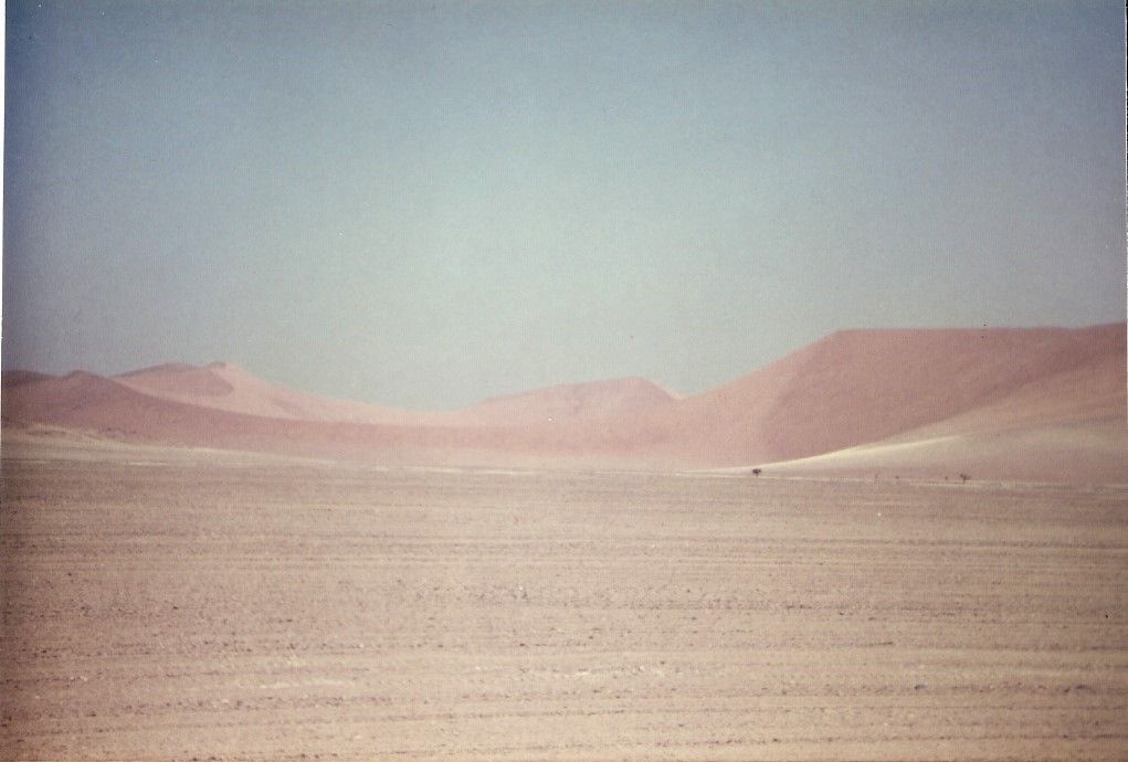Über die schrecklichste Rumpelpiste der ganzen Reise nochmals zu den Dünen, diesmal bei Sossusvlei. Gemsbok und Strauße gesichtet. Landschaftlich ist dies vielleicht die schönste Etappe.