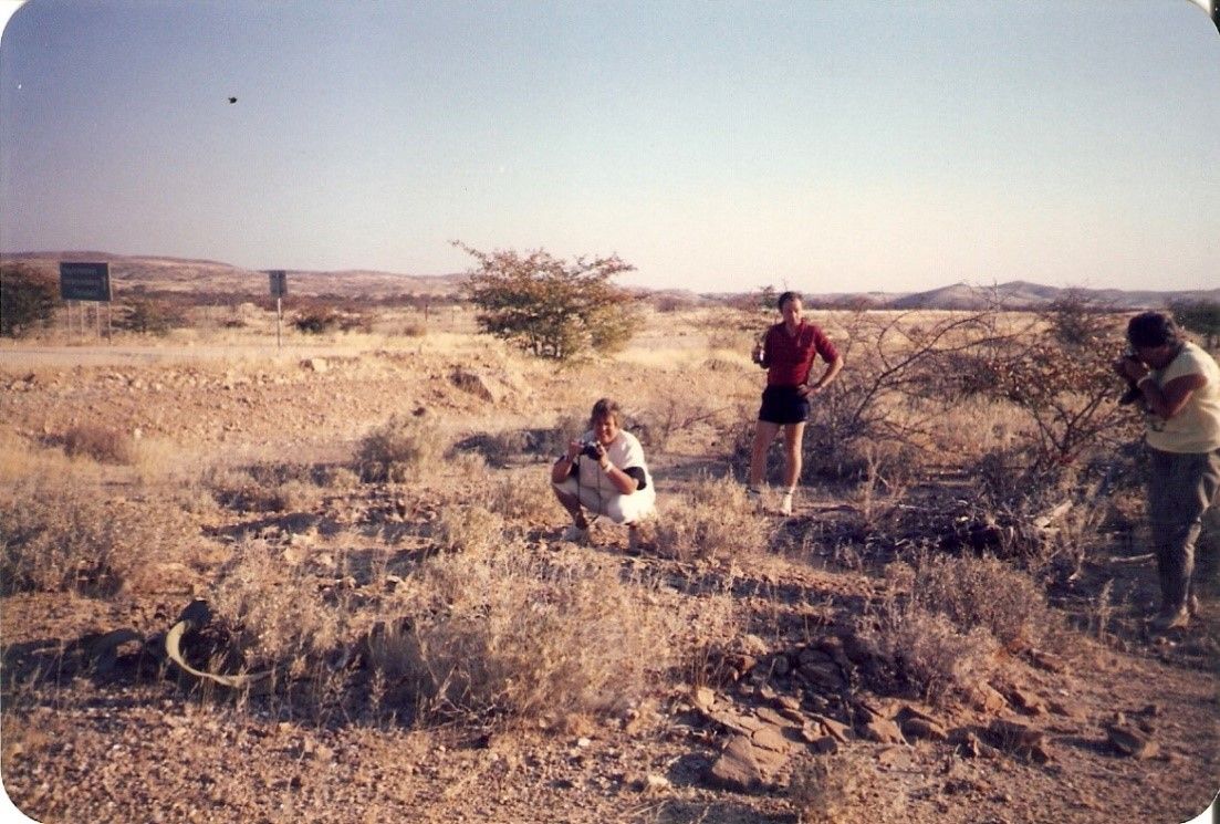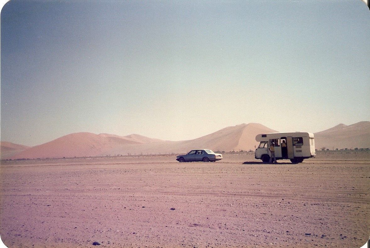 5. August Der Morgen ist wieder sonnig, aber überhaupt nicht lau. Ein eisiges Lüftchen begleitet uns zu Fuß übers Vorfeld hinüber zum wartenden Flugzeug. Zwei Stunden später fallen wir Heinz und Ulli in die Arme, Heinz‘ Mutter und Schwestern. Ich öffne die mitgebrachte Flasche Barack. Mit dem Freund der Schwester muss es während der Autofahrt hierher Zoff gegeben haben. Er zieht es vor, die Namibiareise nicht mitzumachen. Tom wird uns vorgestellt, ein schmaler, lustiger Asiate aus Singapur. Bei einem Drink stellt Heinz uns sein Reiseprogramm vor und gibt uns einige Sicherheitshinweise. Beispielsweise sollen wir keinesfalls anhalten, falls wir in der Wildnis auf ein stehendes Fahrzeug treffen, auch wenn es den Anschein einer Panne hat. Oft werden Überfälle so eingeleitet. Auch politisch ist noch viel Unruhe in Namibia. Zwar hat Südafrika seinen Generaladministrator abgezogen, der bis dahin in Namibia allein herrschte, und eine Südafrika genehme Übergangsregierung eingesetzt, doch müssen alle Gesetze von einem Vertreter Pretorias gegengezeichnet werden. Die namibische Unabhängigkeitsbewegung Swapo verhält sich zwar momentan ruhig, das hat in der Vergangenheit aber auch schon ganz anders ausgesehen. Derzeit liegen die Probleme eher zwischen Südafrika und Botsuana. Erst vor Kurzem hat Südafrika die Hauptstadt Botsuanas, Gaborone, mit Raketen, Granaten und Maschinengewehren beschossen, um Planungs- und Ausbildungsstätten des ANC (African National Congress) zu zerstören, der südafrikanischen Befreiungsbewegung. Heinz‘ Mutter und Brigitte, seine ältere Schwester werden in seinem feinen BMW mitfahren. Marion, die Jüngere, Annamaria und ich im Camper. Tom und ich werden uns als Fahrer abwechseln. Heinz fährt voran, wir folgen. Auch in Namibia herrscht Linksverkehr. Na ja, auf viel Gegenverkehr werden wir nicht treffen. Das heißt nicht, dass wir das Linksausweichen ganz vergessen dürfen. Unser Rechtslenker wird uns daran erinnern. Und schon kann’s losgehen.