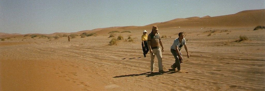 7. August Heute machen wir erstmals Bekanntschaft mit dem ab jetzt vorherrschenden Straßentyp, den Sandpisten. Der Toyota schwimmt im Sand wie ein Motorboot. Ich frage mich, ob dieses Vehikel mit den Hinterrädern lenkt. Heinz‘ BMW hält die Spur sicherlich besser, aber der Wagen tut mir leid. Dem Heinz auch. Der Sand macht vor keiner Ritze halt und ich fürchte er wird sie auch nie wieder verlassen. Der BMW ist Heinz‘ Ein und Alles. Ans Steuer darf nur Ulli. Und ich, weil er seit Töltötoll weiß, wie ich fahre. Es ist eine hohe Ehre für mich. Dass Heinz jetzt seinem geliebten besten Stück den Sand antut, kann nur seiner großen Zuneigung zu uns allen gedankt sein. In den Sandpisten gibt es Spurrillen. Wie im winterlichen Schnee muss man aufpassen, nicht in zwei parallele Rillen zu geraten, die zu weit auseinanderliegen. Sonst kann es leicht sein, dass sich die Landschaft rundum zu drehen beginnt wie ein Ringelspiel. Querrillen gibt es auch. Sie machen die Piste zur Waschrumpel. Die Abstände der Wellen sind unterschiedlich. Für jeden Typus gibt es eine ganz bestimmte Geschwindigkeit, bei der das unerträgliche Rumpeln in ein sattes Brummen mit weniger Erschütterung übergeht. Es bedarf einigen Gefühls, das Tempo mit dem Gaspedal entsprechend zu dosieren. Nicht nur den BMW erobert der Sand, stärker noch den Van. Jetzt hält auch Marion ein Taschentuch vors Gesicht. Zwischen unseren Zähnen knirscht unsichtbares mikroskopisches Geröll. Dazu kommt die Hitze in dem schlecht zu durchlüftenden Van.