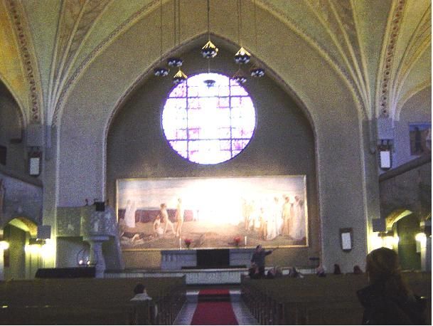 Wir besichtigen die Petri-Kirche und erleben so etwas vom Unterschied zwischen einem reformierten Gotteshaus und einem katholischen Kirchenmuseum. Um das Kirchenschiff herum gruppieren sich Gemeinschaftsräumlichkeiten, die von einem lebendigen Gemeindezentrum künden. Die Menschen, die dieses Zentrum benutzen, befinden sich im Hause ihres Gottes, das aber auch ihr eigenes und durch und durch bewohnbar ist. Es gibt Versammlungsräume für Vorträge, Arbeitsräume für Bibelstudium, eine modern eingerichtete Küche und ein WC. Ich wage es, darauf hinzuweisen, dass Gotteshäuser auch anderer Religionen so organisiert sind, etwa Moscheen.