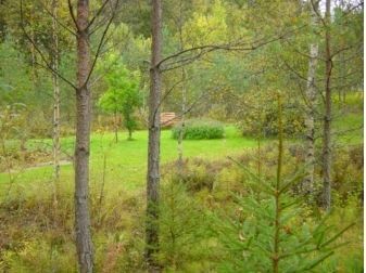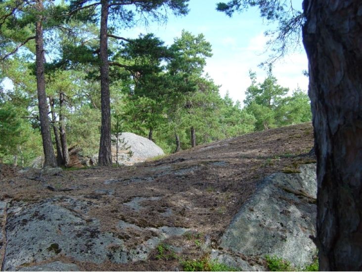 Drüben setzt das weitläufige Grundstück sich fort, Wiesenflecken mit einzelnen Föhren und Fichten gehen über in einen Wald, der gegen einen steinigen Mäki hin ansteigt und zum Besteigen einlädt.
