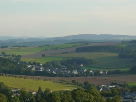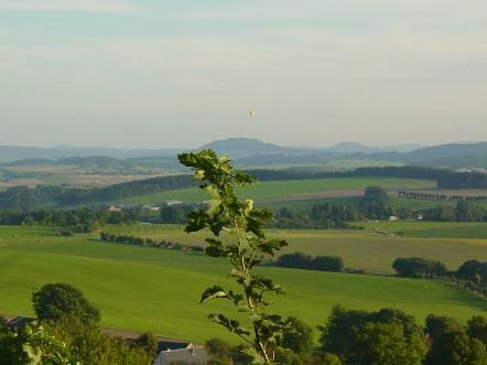 Von diesem Balkon aus bietet sich eine wahrlich wunderbare Aussicht in einem Halbrund von Südwest bis Nordost, hinüber über das Erzgebirge tief hinein nach Böhmen. Der Abend glänzt mild über den Feldern und Wäldern und gemächlich zieht ein Heißluftballon über den Himmel. Wo er wohl landen wird heute Abend?