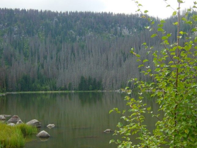 Unsere Blicke schweifen über den See, hinauf zum Plöckensteinfelsen, über die Wälder. Und da fällt uns auf: Der Wald ist in dieser Höhe, über 1100 Meter, weitgehend tot, die Nadelbäume weitflächig abgestorben. Ich erinnere mich an solche Bilder bei Berichten über das Waldsterben infolge Umweltverschmutzung. Aber mit eigenen Augen habe ich so etwas noch nie gesehen.
