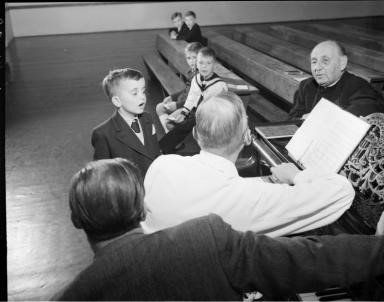 Eines Tages, es muss wohl um die Zeit meiner steilen Schauspielerkarriere an der Scala gewesen sein, fragt meine Oma mich, ob ich nicht zu den Sängerknaben wolle. Zwar habe ich von denen schon gehört, aber eine richtige Vorstellung davon habe ich wohl nicht. Trotzdem sage ich sofort ja und noch am selben Tag bin ich bei der Aufnahmeprüfung zum Vorsingen. Es sind vielleicht dreißig Knaben da. Unter dem strengen Blick von Rektor Josef Schnitt, der in seiner Soutane anwesend ist, müssen wir unser Gefühl für Rhythmus und Gehör unter Beweis stellen, indem wir diverse vom Kapellmeister vorgeklatschte Rhythmen nachklatschen und ein paar auf dem Klavier vorgespielte Töne nachsingen oder aus einem angeschlagenen Dreiklang den mittleren Ton herausfiltern. Zum Schluss hat jeder noch ein Lied vorzutragen. Die Meisten wählen J. W. Goethes/Heinrich Werners ‚Heidenröslein‘, das scheint mir aber zu affig, doch fällt mir auch nichts Anderes ein als ‚Kann denn Liebe Sünde sein‘, aber die Stimme Zarah Leanders imitieren? In der Schule haben wir ‚Kling Klang Tellerlein, wer steht da vor der Tür‘ gelernt. Leider erinnere ich nur wenig mehr als die erste Textzeile, die ich also unbeirrt wiederhole. Zu meiner Überraschung werde ich aufgenommen. Das klingt nun nicht so sehr nach Schmissen, doch Geduld, Geduld, die folgen gleich.