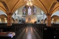 Mit den erwähnten vier großen Spitzbögen an der Außenseite korrespondieren hier im Innern vier Kreuzgewölbe, die das Schiff bilden. Die Grate der Gewölbe neigen sich tief den Basen entgegen, die ihrerseits den Graten entgegenstreben, sodass zwischen ihnen die schlanken Säulen selbst ziemlich kurz bleiben können. Ist der Himmel auch hoch, so ist er doch so nah. Emporen zu beiden Seiten bilden die Seitenschiffe. Integriert in die Stirnwand gibt ein wuchtiger Spitzbogen, dem Strahlenornamente seine Bedrohlichkeit zu nehmen versuchen, den Zutritt zur Apsis frei. Ihre drei Bleiglasfenster sind die einzigen bunt bemalten in der Kirche. Alle anderen sind milchig weiß ohne Abbildungen. Orgelmusik erklingt zur Unterstützung des Gesangs der Gemeinde. Sie kommt von hinten. Ich drehe mich um. Die Orgel thront auf der Empore über dem Refektorium unter einem Spitzbogen, der jenen vor der Apsis spiegelt. Artig gruppieren sich die Orgelpfeifen so, dass sie dem Licht Platz lassen, das durch das große Rundfenster einfällt.